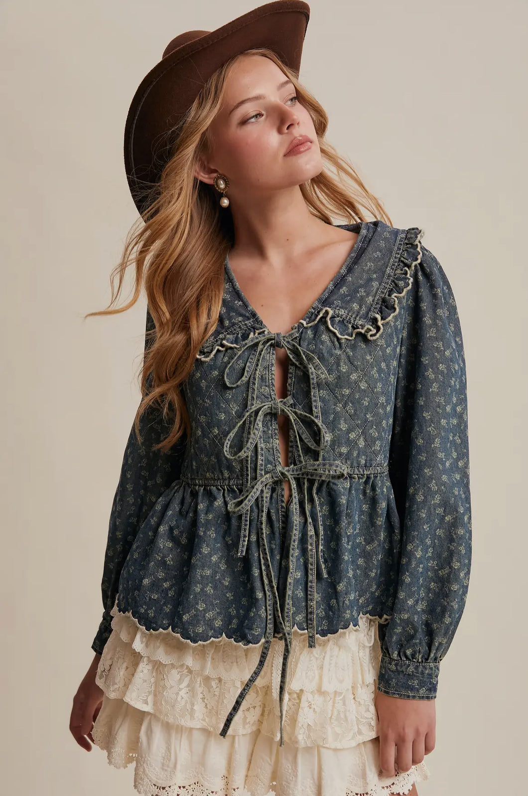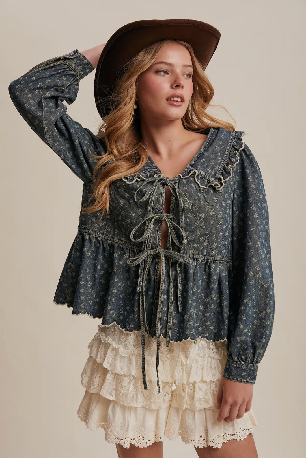 The Blue Jean Baby Top is a jean ruffled collar tie-front denim blouse.