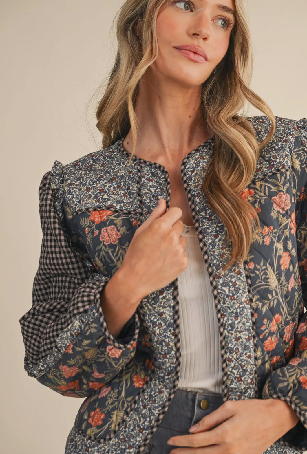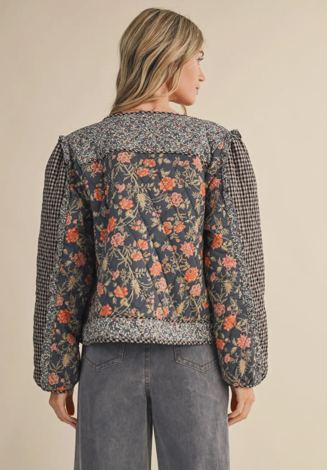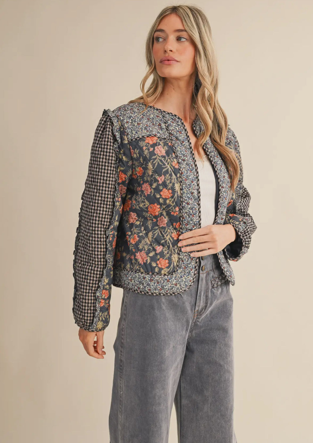 The Lainey Jacket is a mixed print jacket with ruffle trim.