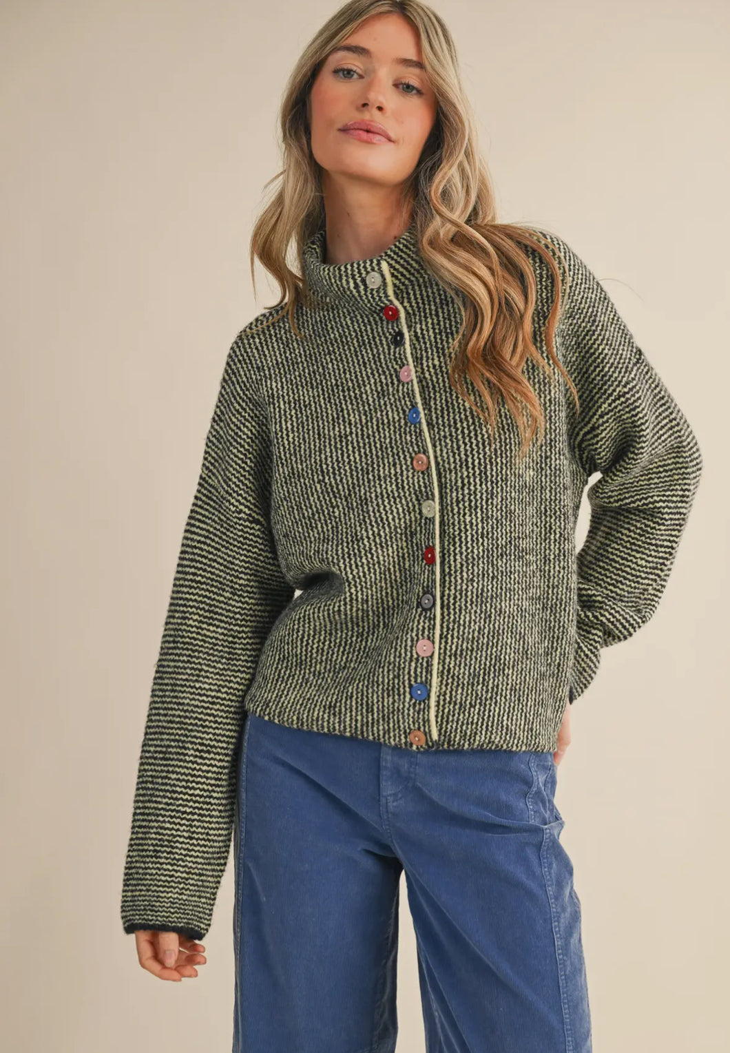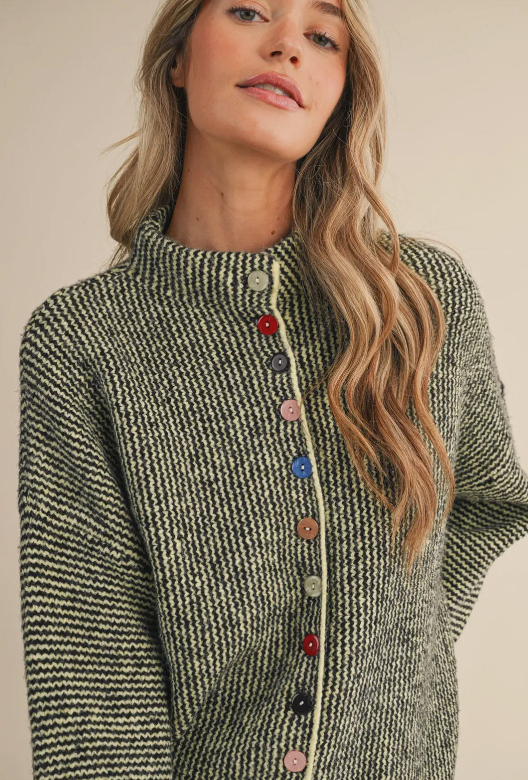 The Shelby Sweater is a black lime striped sweater cardigan with fun colorful buttons.