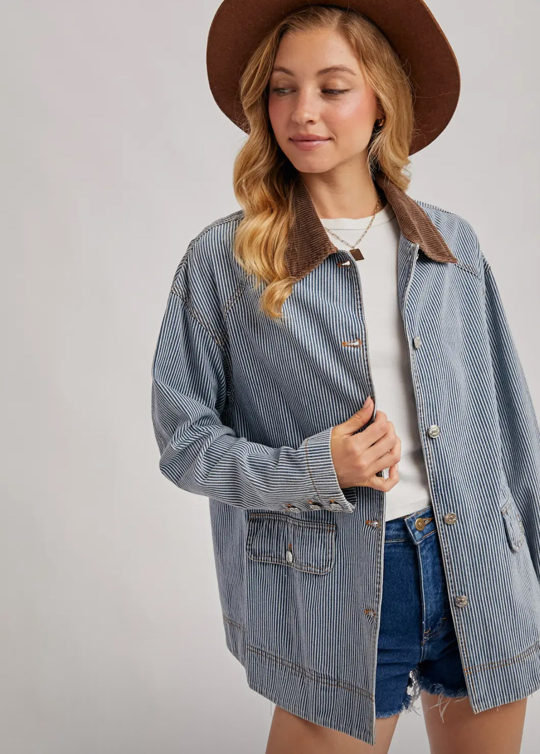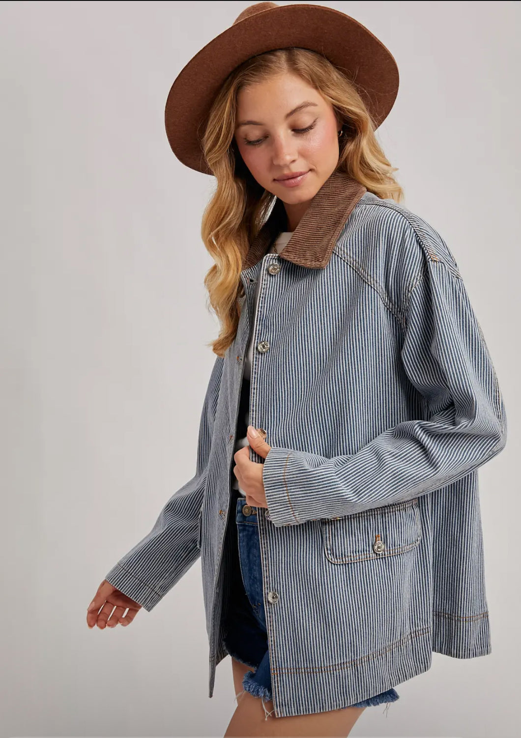 The Barn Shacket is a pin striped blue denim jacket with corduroy collar.