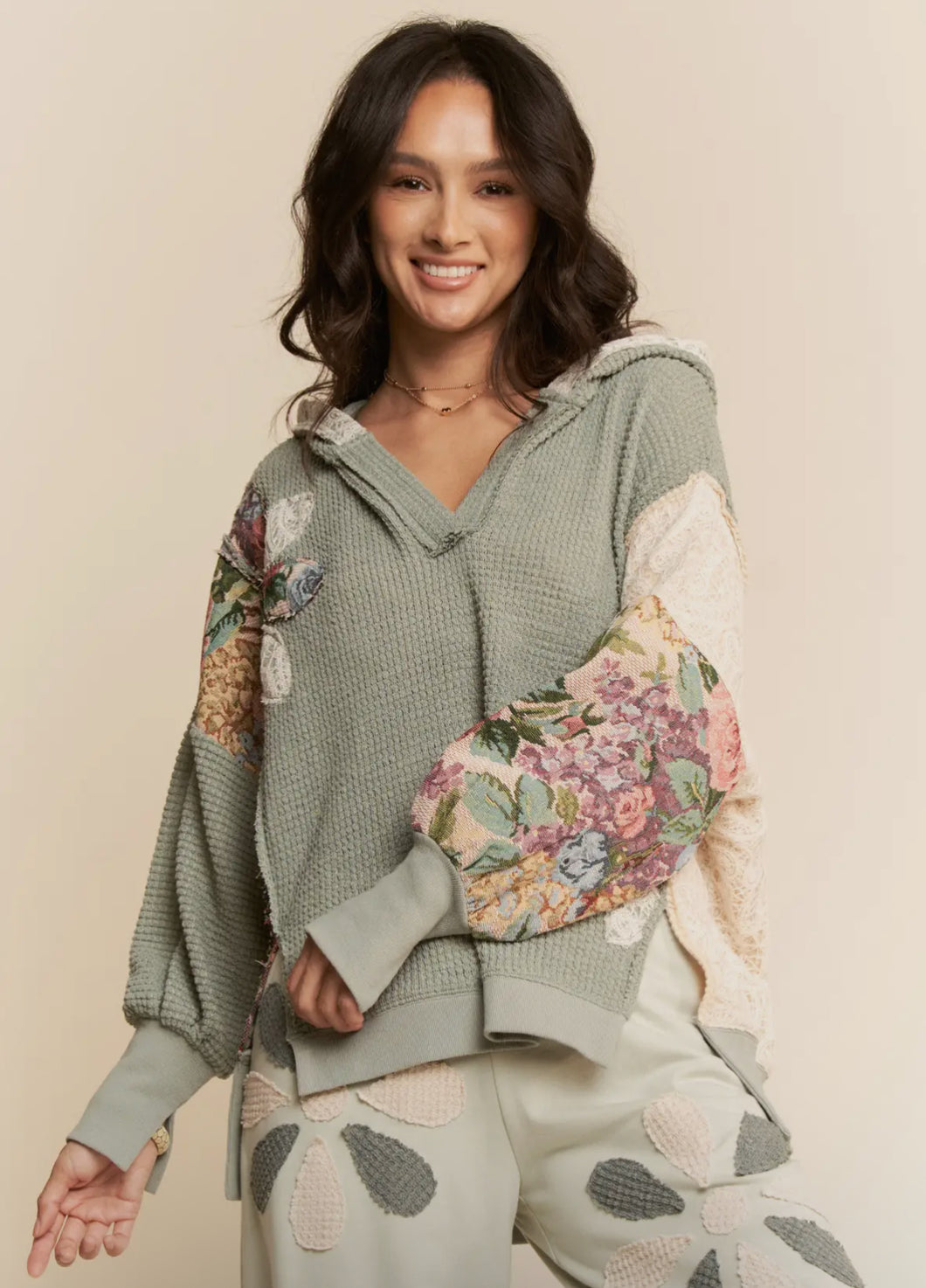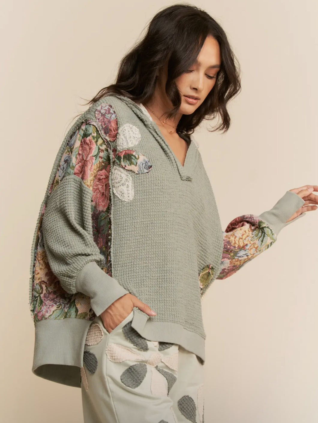 The Aurora Too is a beautiful mint green waffle knit flower patchwork hoodie top.