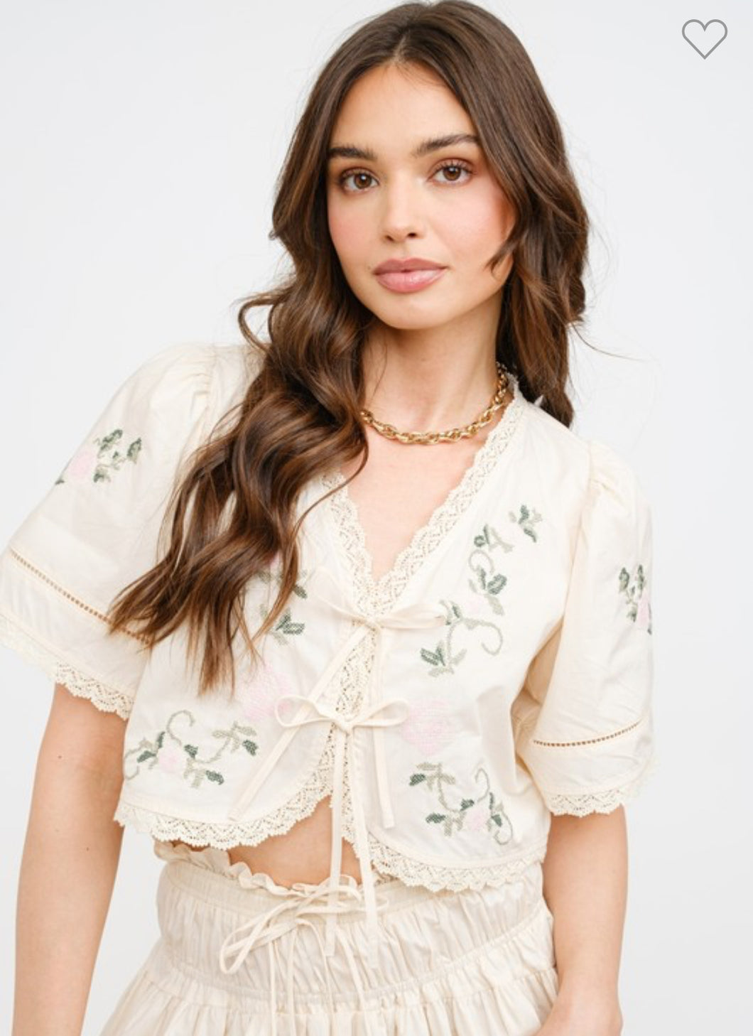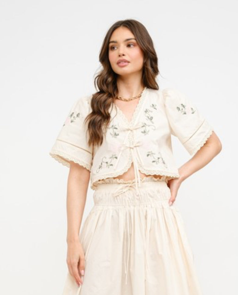 The Emma Top is a beautifully made cotton poplin cropped blouse with floral embroidery.