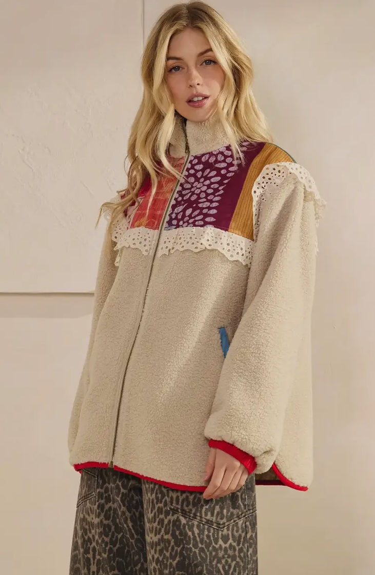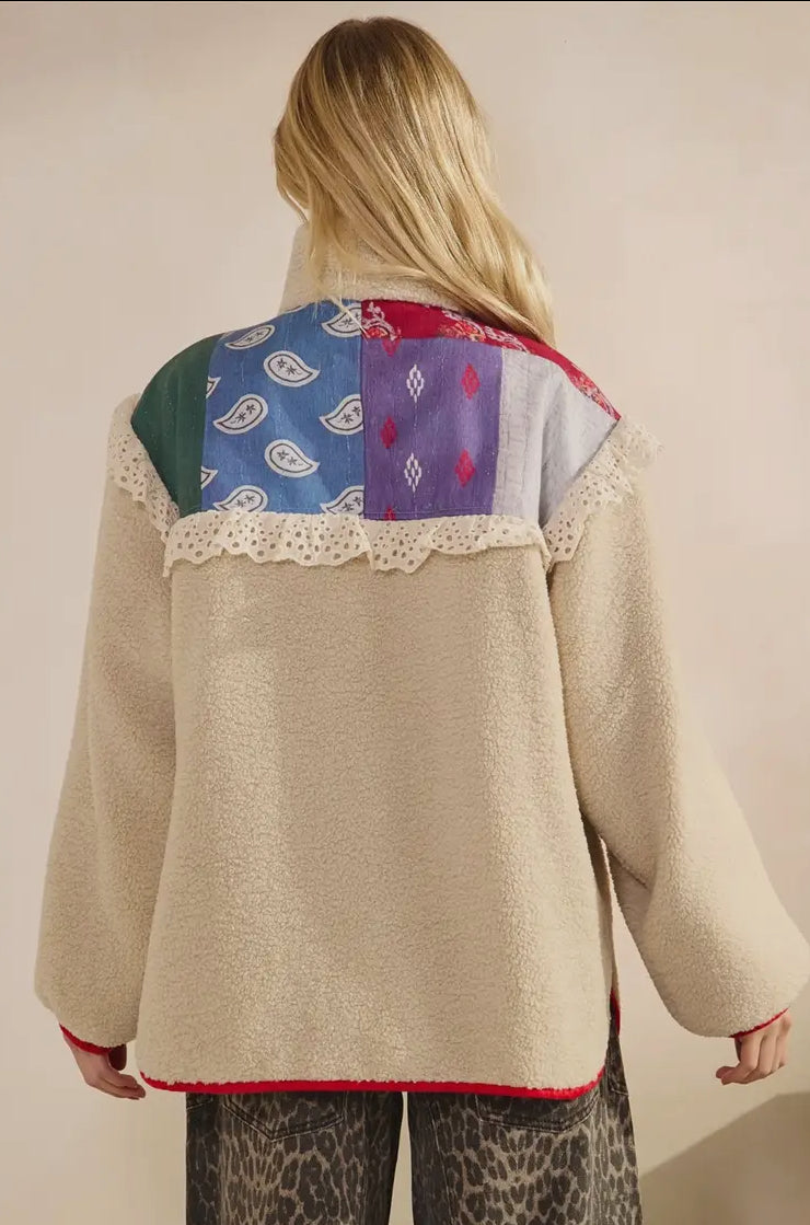 The Faye Pullover is a comfy cute teddy sherpa pullover with a fun pattern and lace detail.