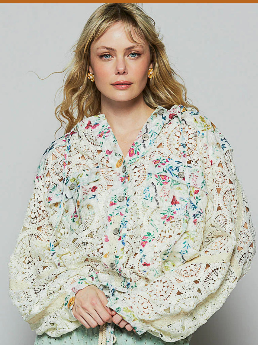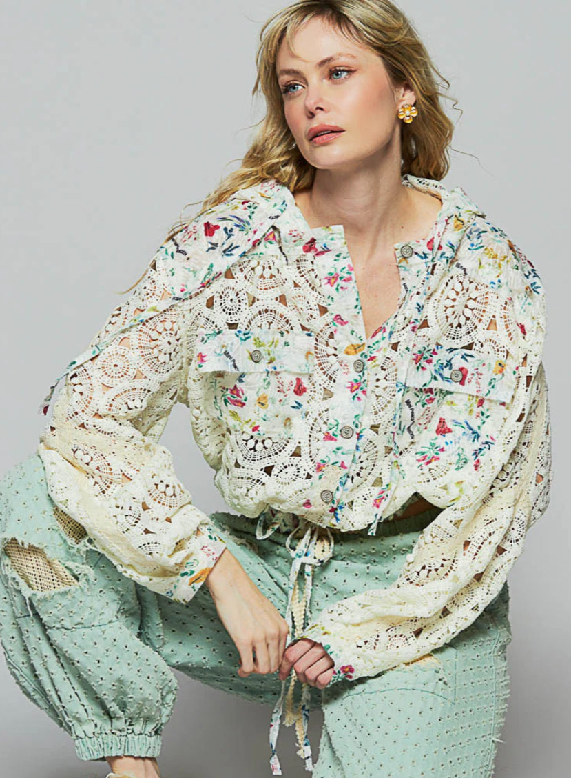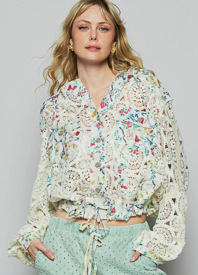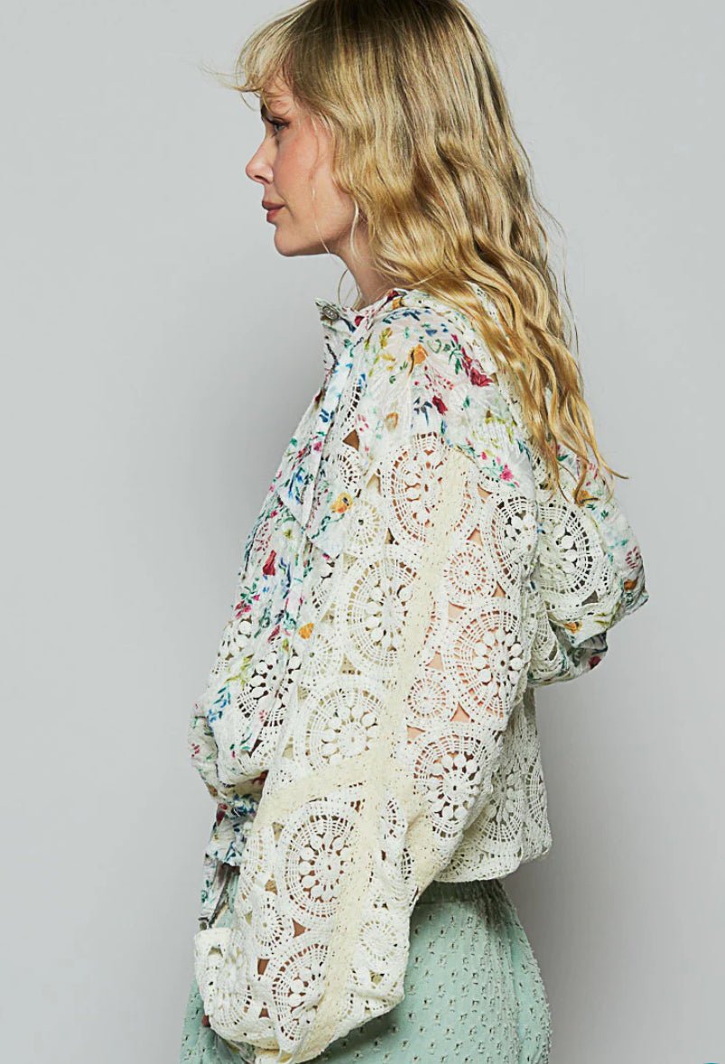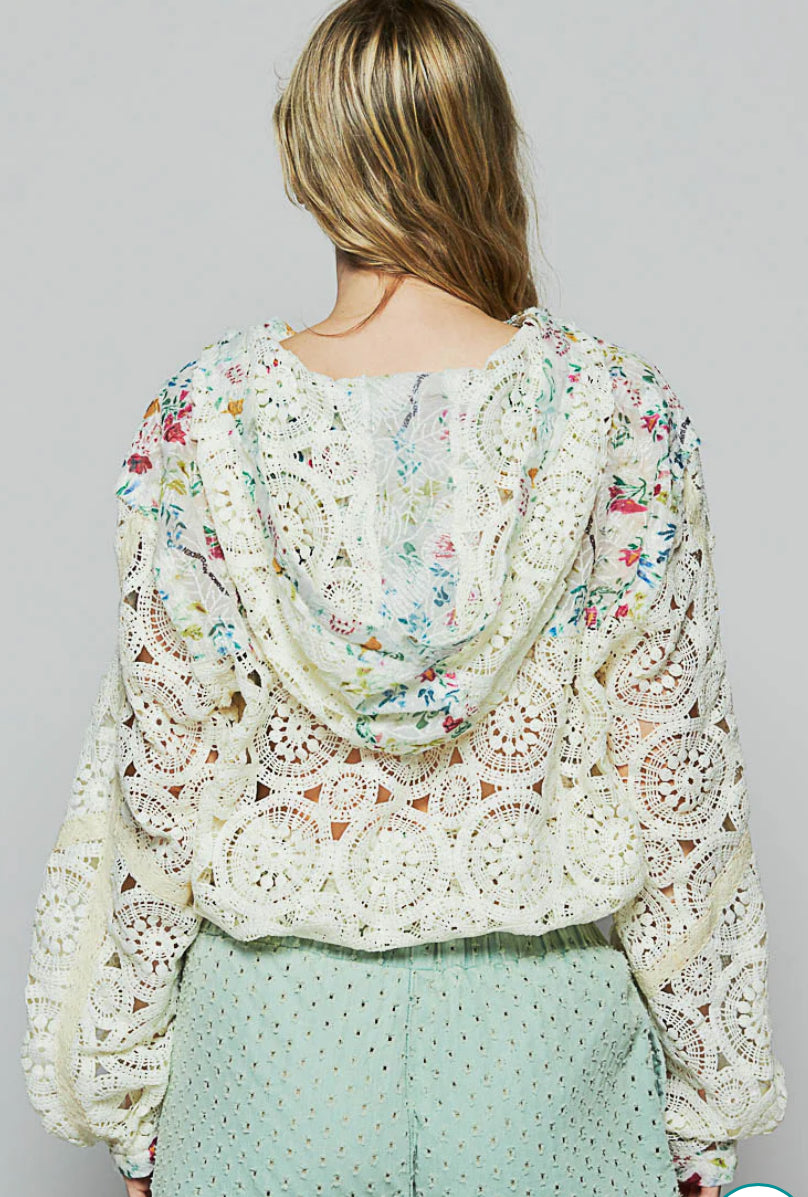 The Garden Top is a beautiful lace and crochet fabric with bright colored floral print and a hood.