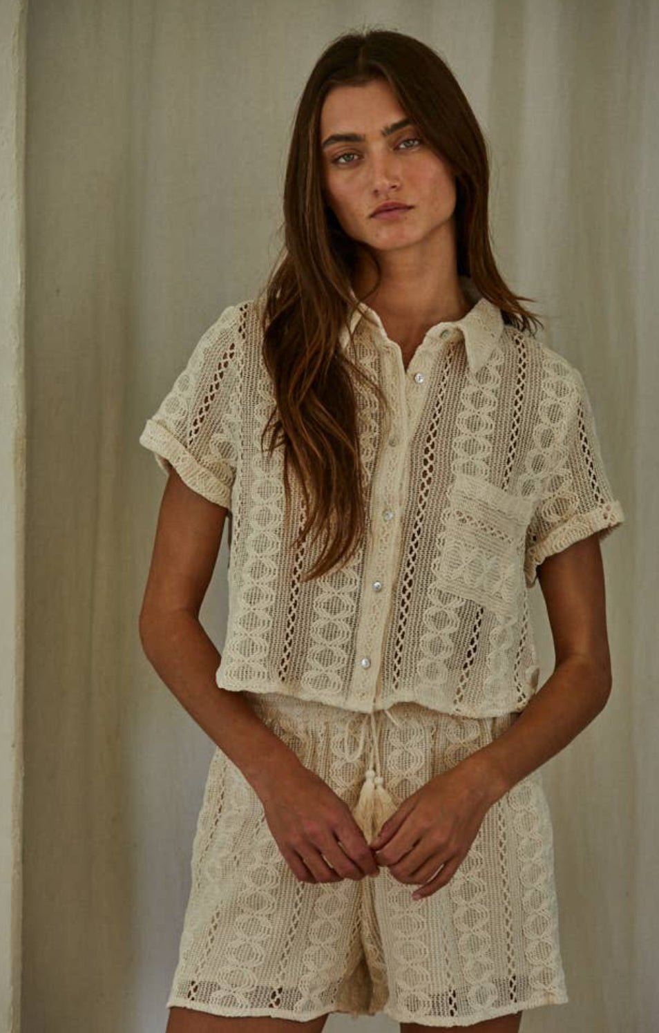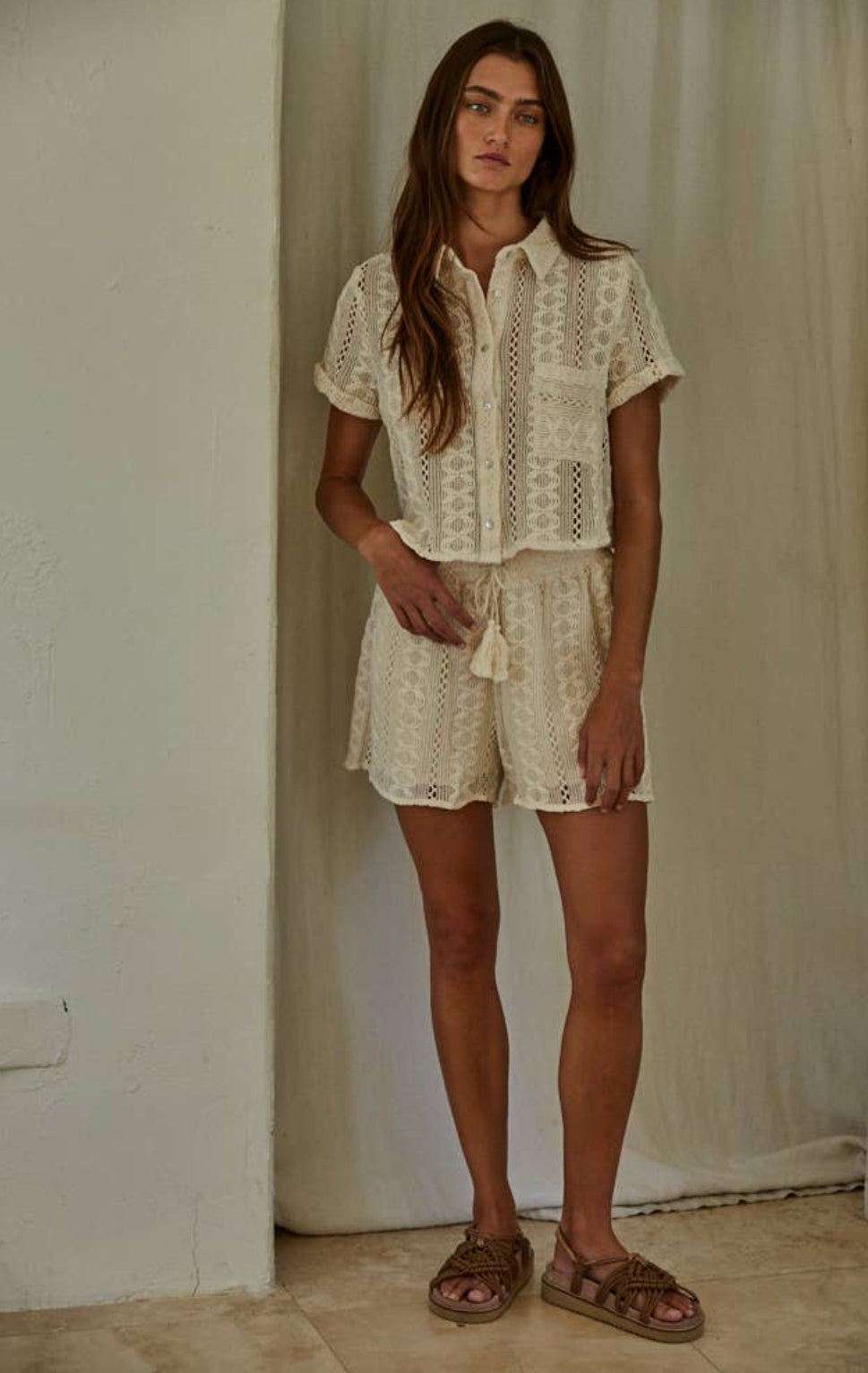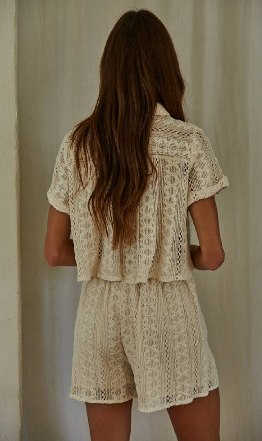 The Hayden Set is a crochet shorts and button up top set.