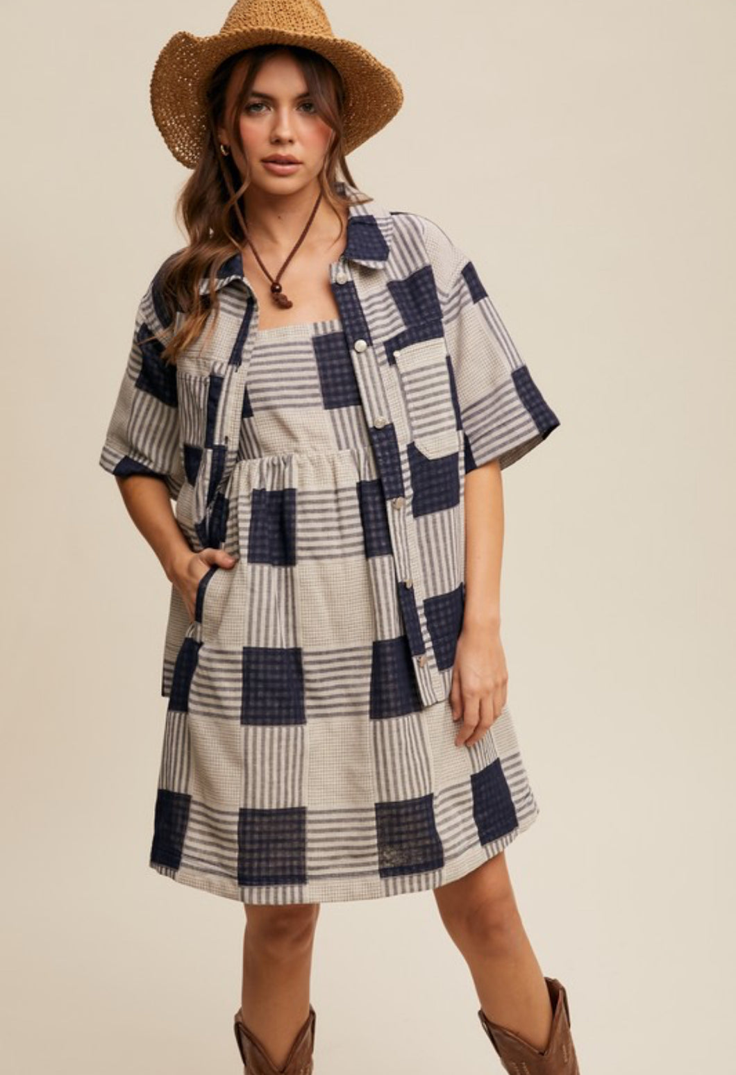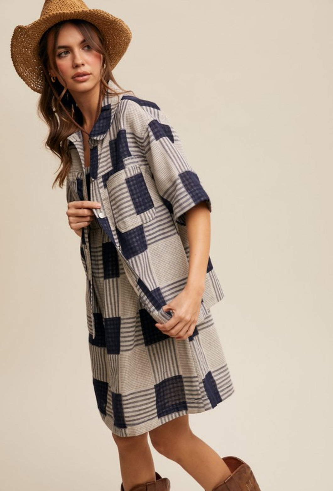 The Twyla set is a beautiful navy plaid two piece set with a spaghetti strapped with and short sleeve button up.