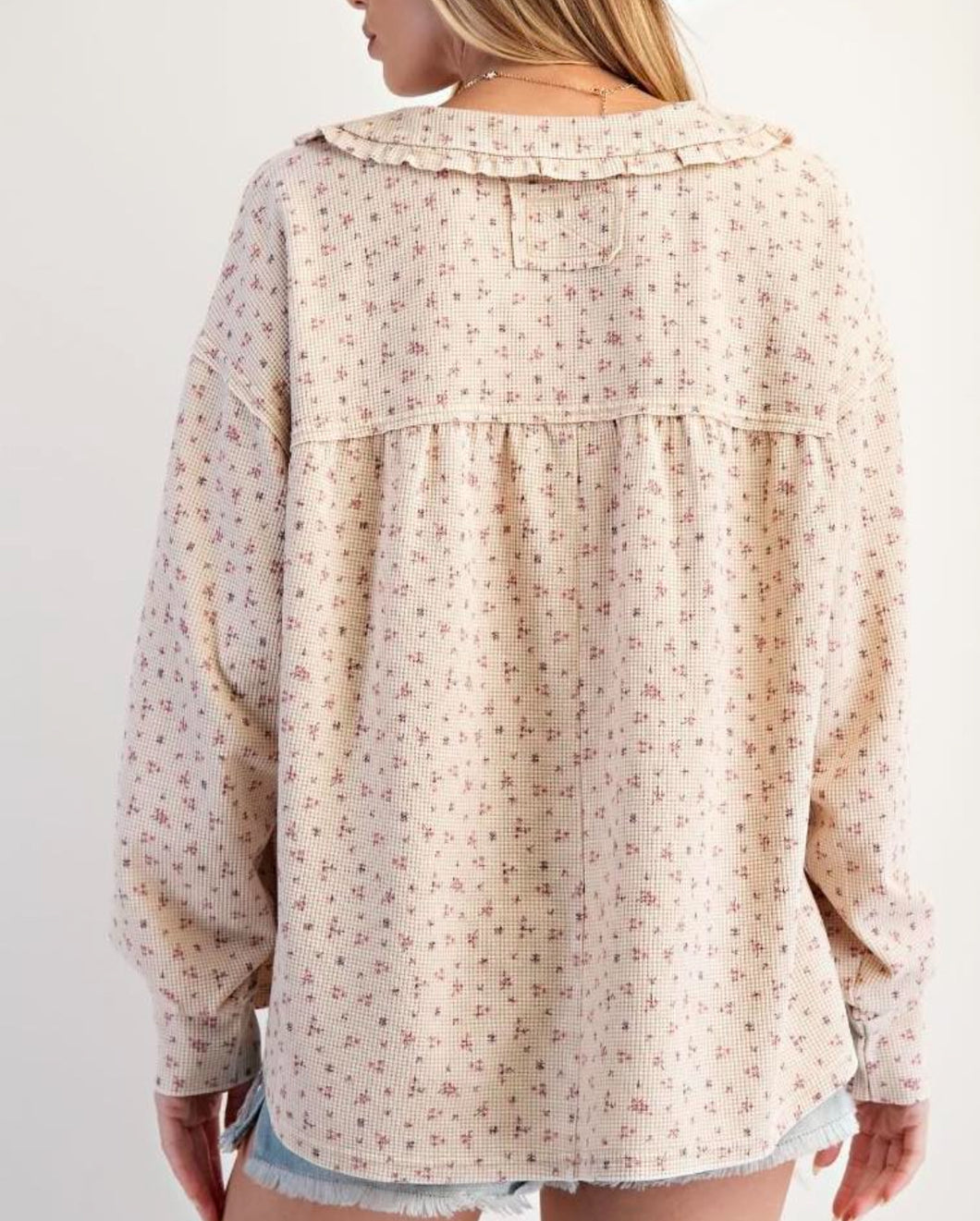 The Lillian Top is a cute thermal waffle knit ditsy floral print top with a peter pan collar.